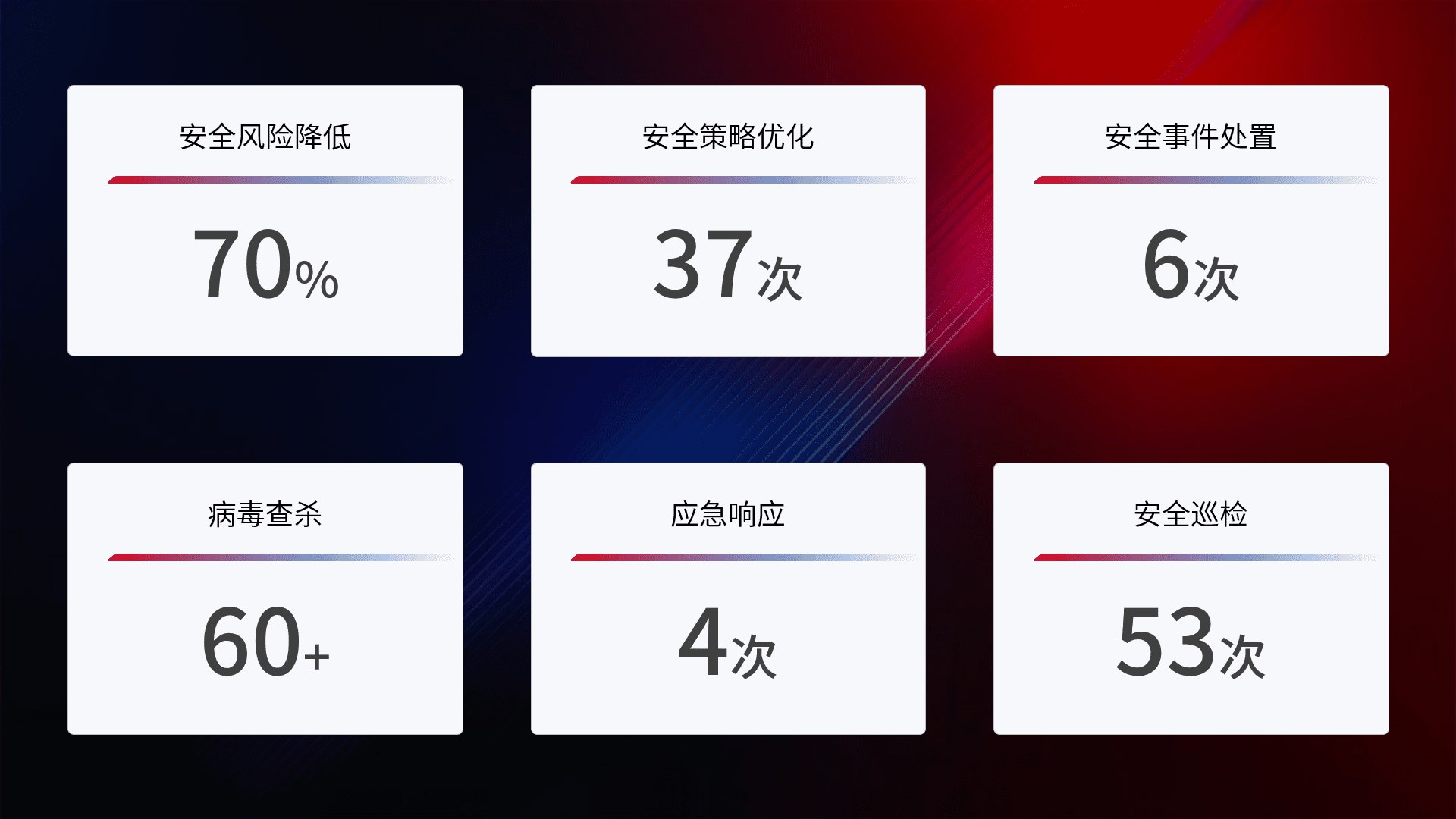 提供全面的安全事件报告体系,,,,包括处置报告、、、、周报、、季度和年度总结,,结合持续监控,,,帮助客户深入了解网络安全状况。。。